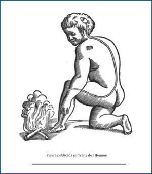 “Así por ejemplo, si el fuego A se encuentra cercano al pie B, las pequeñas partículas de este fuego que, como se sabe, se mueven con gran rapidez, tienen fuerza para mover asimismo la parte de piel contra la cual se estrellan; de esa forma, estirando el pequeño filamento C que se encuentra unido al pie, abren en ese instante la entrada del poro d, e, en el que se inserta el pequeño filamento: del mismo modo que cuando se produce el sonido de una campana, cuyo badajo está unido a una cuerda, pues se produce en el mismo momento en el que se tira del otro extremo de la cuerda. Cuando se ha abierto la entrada del poro y el pequeño conducto d e, los espíritus animales de la concavidad F (glándula pineal) penetran en su interior y se desplazan a través del mismo hasta distribuirse en los músculos que se utilizan para retirar el pie de ese fuego, y también por los músculos que sirven para girar los ojos y la cabeza para ver el fuego, así como para mover las manos y plegar el cuerpo para defenderse. Pero ellos también pueden ser llevados por los mismos conductos d e, a varios otros músculos”.