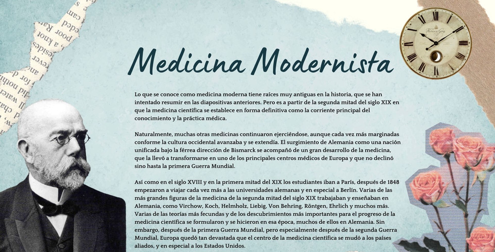 Lo que se conoce como medicina moderna tiene raíces muy antiguas en la historia, que se han intentado resumir en las diapositivas anteriores. Pero es a partir de la segunda mitad del siglo XIX en que la medicina científica se establece en forma definitiva como la corriente principal del conocimiento y la práctica médica.